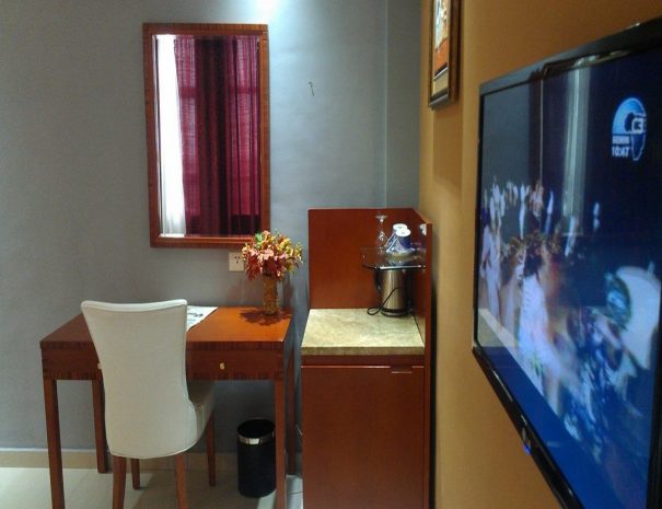 guests. It features a double bed, flat-screen TV, mini-bar, desk, safe, kettle, wardrobe, and